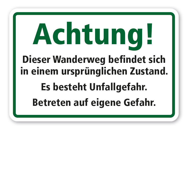 Schild Achtung - Dieser Wanderweg befindet sich in einem ursprünglichen Zustand - Es besteht Unfallgefahr - Betreten auf eigne Gefahr. Diese Schild ist in diversen Größen erhältlich – auch mit Ihren individuellen Inhalten für eine bedarfsbezogene Beschilderung.