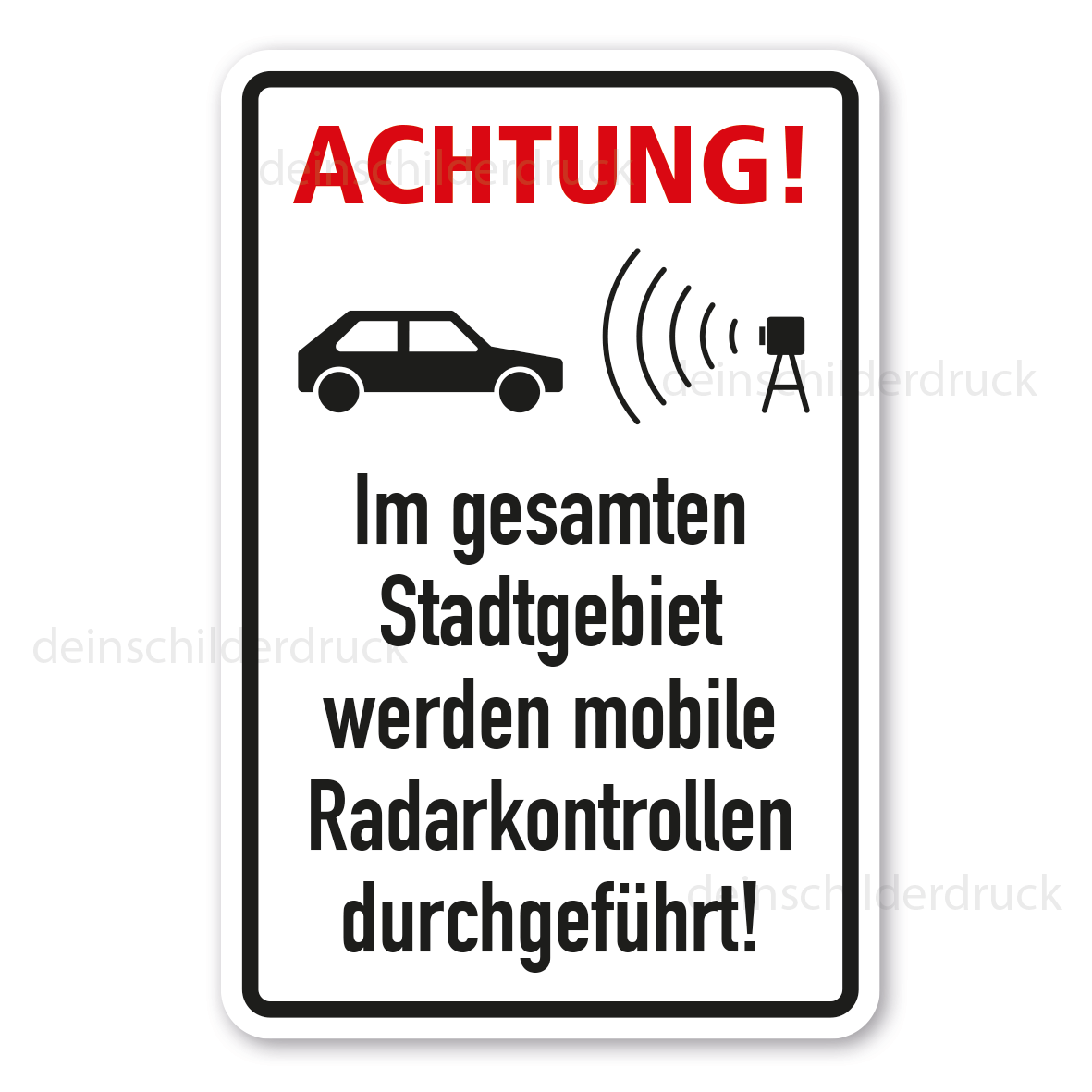 Produktinformationen "Hinweisschild Achtung - Im gesamten Stadtgebiet werden mobile Radarkontrollen durchgeführt"