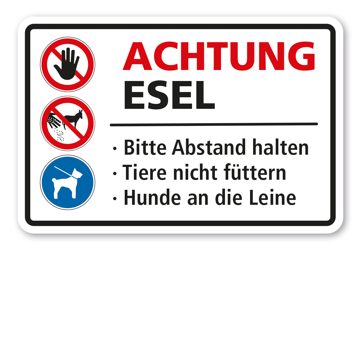 Produktinformationen "Weideschild Achtung Esel - Bitte Abstand halten - Tiere nicht füttern - Hunde an die Leine – mit Verbots- und Gebotssymbolen"