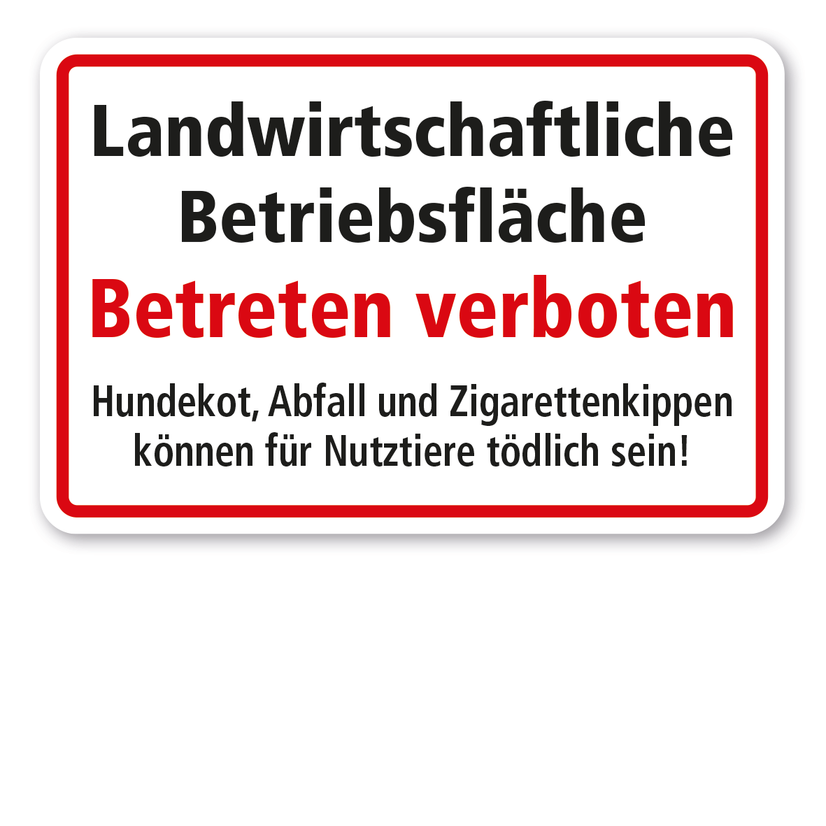 Hochwertiges Weideschild / Hinweisschild Landwirtschaftliche Betriebsfläche - Betreten verboten - Hundekot, Abfall und Zigarettenkippen können für Nutztiere tödlich sein als Verbotsschild für Tierweiden. Weideschilder sind Schilder, die in Form von Verboten, Geboten oder Warnungen Menschen informieren, wie sie sich an Weiden und Tiergehegen verhalten sollen. So klären Weideschilder Unwissende z.B. auf, dass das Füttern der Weidetiere, so gut es auch gemeint ist, aufgrund gesundheitlicher Risiken nicht erwünscht ist, informieren aber auch über möglich Gefahren, die beim unbefugten Betreten der Weide gegeben sind – z.B. auf einer Bullenweide. Unsere Weideschilder werden nicht aus Kunststoff gefertigt, der nur für einen max. mittelfristigen Einsatz geeignet ist, sondern aus 2 mm Hartaluminium für eine sehr lange Einsatzdauer, auch bei extremen Witterungen.