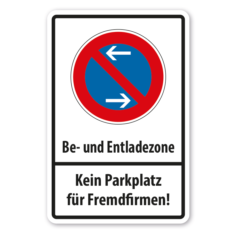 Parkplatzschild Be- und Entladezone - Kein Parkplatz für Fremdfirmen - eingeschränktes Halteverbot Mitte - Rechtsaufstellung - Verkehrsschild. Mit Halteverbotsschildern weisen Sie gezielt auf Bereiche hin, auf den nicht oder nur eingeschränkt geparkt werden darf. Unsere Parkplatzschilder / Halteverbotsschilder sind in der Symbolik nach StVO oder in einer auf Ihre persönlichen Bedürfnisse zugeschnittenen Ausführung in vielen Varianten zur Markierung von Halteverbotsbereichen der Städte, Gemeinden und Unternehmen wie auch in Parkhäusern erhältlich.