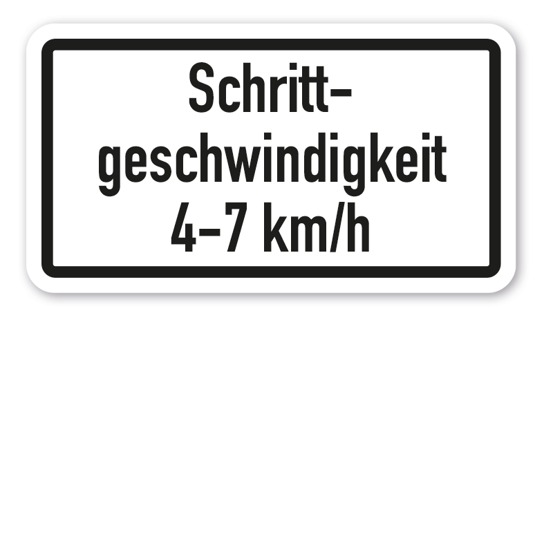 Zusatzzeichen für Verkehrsschilder oder Parkplatzschilder – Schrittgeschwindigkeit 4-7 km/h - Verkehrsschild. Zusatzzeichen werden in der Regel mit Verkehrsschildern kombiniert und konkretisieren die bildlichen Aussagen dieser in Form von reinen Texthinweisen, Texthinweisen mit weiteren Symbolen oder nur Symbolen. Zusatzzeichen oder Zusatzverkehrsschilder sind als Standardschilder nach StVO erhältlich oder als Sonderschilder mit individuellen Textinhalten oder Symbolen für die bedarfsbezogene Nutzung.