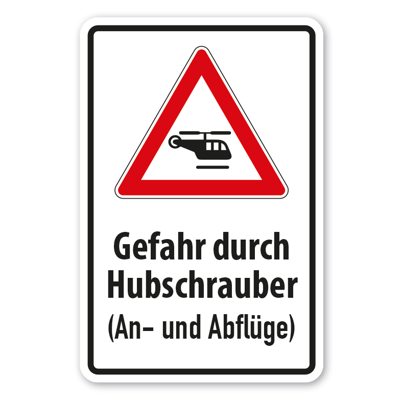 Verkehrsschild Gefahr durch Hubschrauber - An- und Abflüge. Kombinationsschilder sind Schilder mit einem oder mehreren Verkehrszeichen nach StVO, häufig kombiniert mit genormten Verbotszeichen, Gebotszeichen, Warnzeichen oder praxisbewährten Zeichen sowie ergänzenden Textinhalten, die unterhalb oder neben den Zeichen angeordnet sind. Aufgrund dieser Kombination und auch der Möglichkeit, bestehende Inhalte zu verändern, erfüllen Kombinationsschilder alle Anforderungen, um eine flexible, individuelle Beschilderung sicherzustellen. Wir führen zahlreiche Kombinationsschilder für die betriebliche oder kommunale Beschilderung in vielen Schildervarianten in standardisierten oder individuellen, an Ihre Bedürfnisse angepassten Ausführungen.