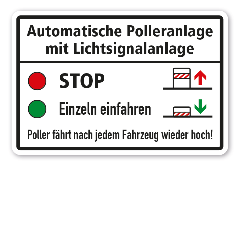 Betriebsschild für Polleranlagen Automatische Polleranlage mit Lichtsignalanlage - Poller fährt nach jedem Fahrzeug wieder hoch.
