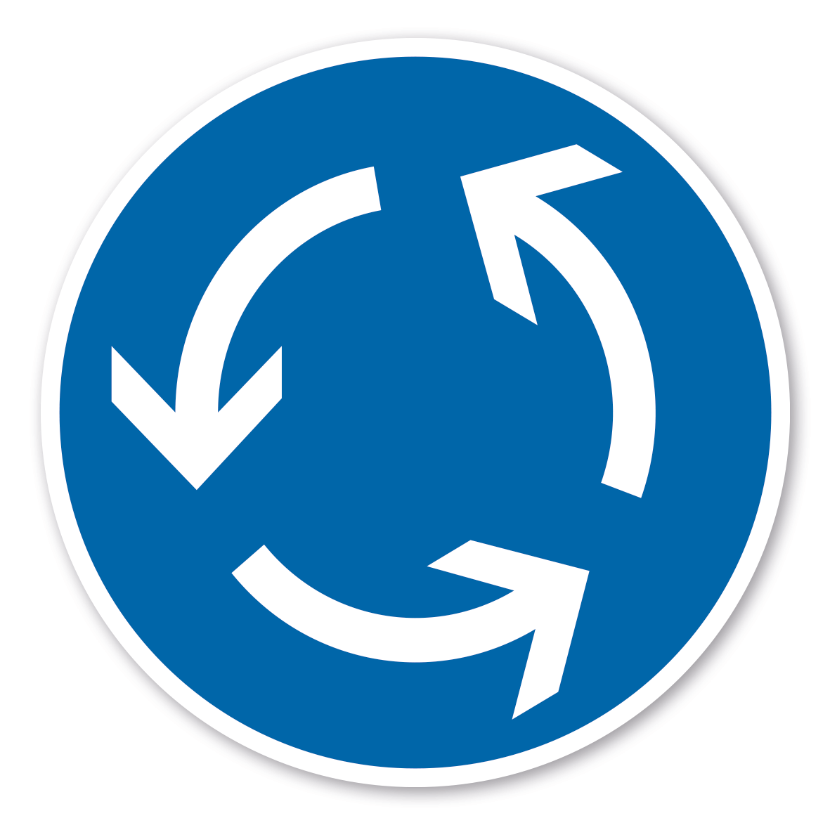 Verkehrsschild / Vorschriftsschild Kreisverkehr. Vorschriftsschilder nach StVO stellen im Straßenverkehr eine Anordnung dar, die am Standort des Schildes oder ab diesem zu befolgen ist. Dieses Verkehrszeichen kann als Einzelschild oder in Kombination mit Zusatzzeichen, die die Symbolik näher erläutern, eingesetzt werden.