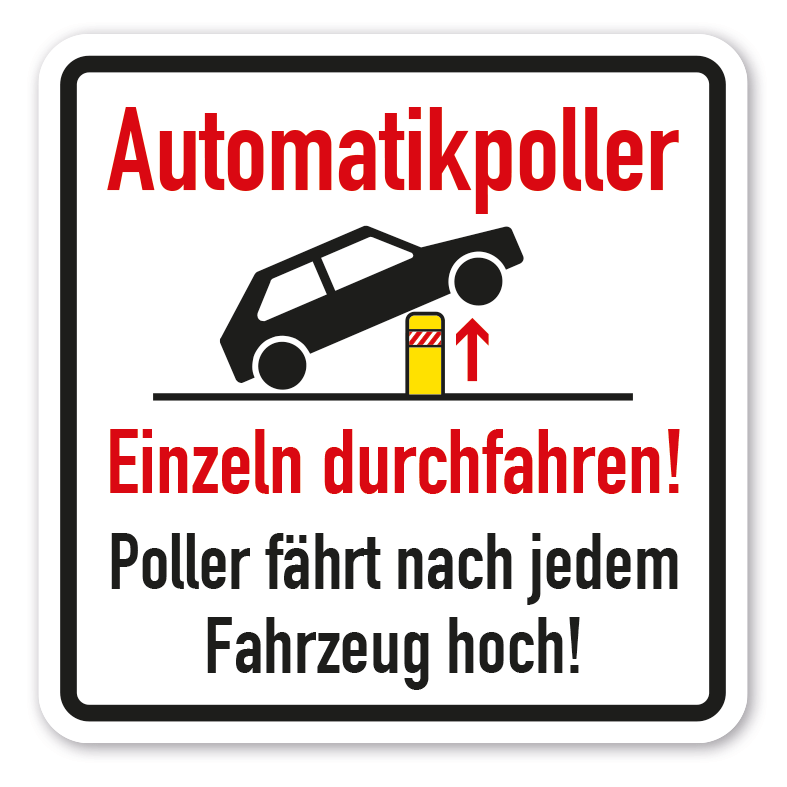Auffälliges Schild für Polleranlagen - Automatikpoller - Einzeln durchfahren - Poller fährt nach jedem Fahrzeug hoch. In diversen Größen aus 2 mm Hartaluminium erhältlich.