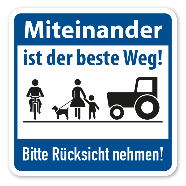Auffälliges Schild zur gemeinsamen Wegnutzung - Miteinander ist der beste Weg - Bitte Rücksicht nehmen - mit Traktor. In diversen Größen aus 2 mm Hartaluminium und in drei Farbvarianten erhältlich.
