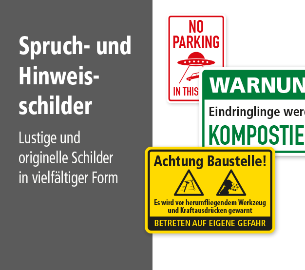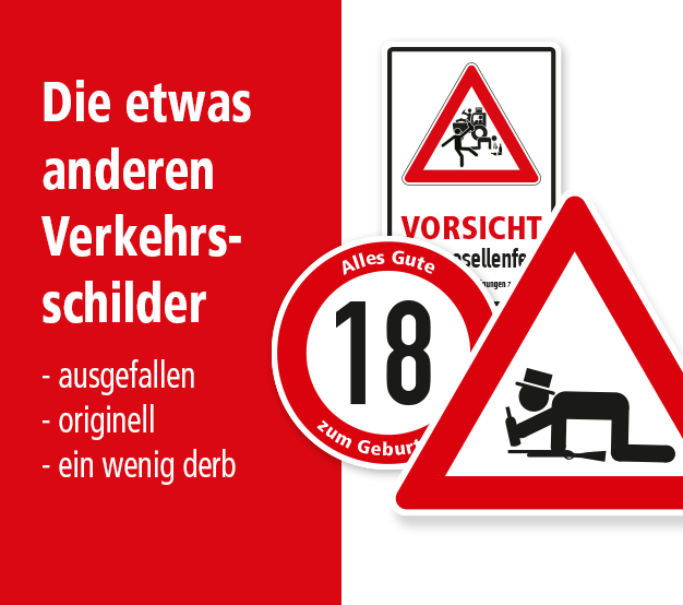 Für Liebhaber des derberen Humors bieten wir eine Reihe lustiger Schilder in Form von Verkehrszeichen und Verbotsschildern in Originalausführung, jedoch mit ausgefallenen Inhalten, wie auch keinesfalls normgerechte Brandschutzzeichen an. Die Themenverfügbarkeit dieser Schilder ist so vielfältig wie der jeweilige Verwendungszweck, doch eines ist garantiert: zu Hause oder am Arbeitsplatz, auf Partys, Junggesellen- oder Schützenfesten sorgen unsere spaßigen Verkehrs- , Verbots- und Brandschutzzeichen für Aufsehen und reichlich Gelächter.