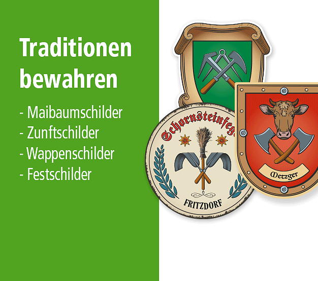 Aber auch für Freunde der Brauchtumspflege bieten wir zahlreiche Schilder an, die in Form von Maibaumschildern, Zunftschildern, Zunftwappen und Festschildern erhältlich sind. Unsere Maibaumschilder können in diversen Ausführungen und Farben bezogen werden, mit vielen einzigartigen Zunftzeichen, die ihren historischen Vorbildern liebevoll nachempfunden wurden. Ein gewünschtes Zunftzeichen nicht dabei? Schreiben Sie uns eine E-Mail – wir erweitern gerne unser Angebot an Zunftwappen und Zunftzeichen (soweit umsetzbar), um Ihnen ein breit gefächertes Sortiment an Maibaumschilder und Festschildern zur wichtigen Brauchtumspflege zur Verfügung zu stellen. Unsere Maibaumschilder sind exklusiv nur bei uns erhältlich und eine Zierde an jedem Maibaum oder im Festsaal.