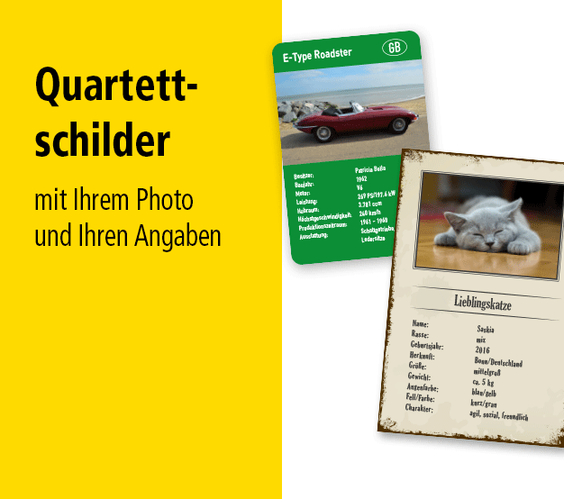 Soll es hingegen nicht der Retrostil sein, produzieren wir selbstverständlich auch natürliche Photoschilder im Hoch- oder Querformat mit Ihren individuellen Bild- und Textinhalten – mit Ihren Tierphotos, Familienbildern, Urlaubsphotos u. a. – zum Aufstellen oder Aufhängen, als hochwertige Dekoschilder, Hundeschilder für Ihr Gartentor oder als Boxenschilder im Pferdestall. Den Möglichkeiten sind keine Grenzen gesetzt.