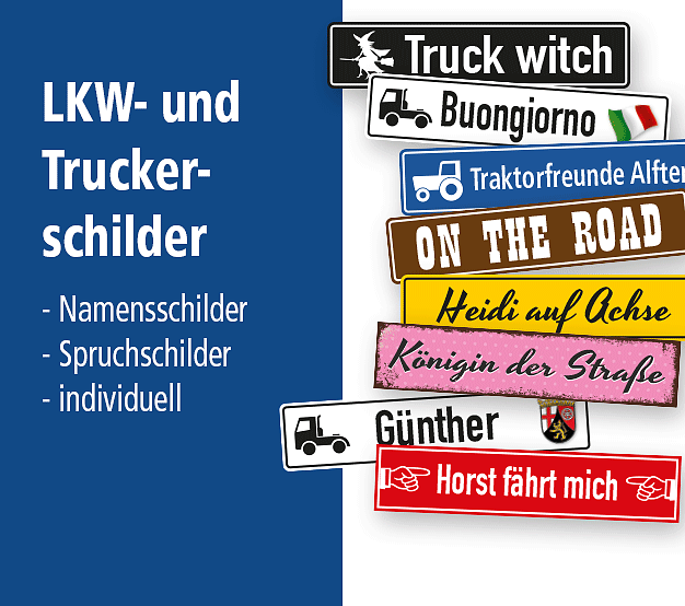 Sie sind beruflich mit einem LKW unterwegs oder suchen für einen Brummifahrer oder Brummifahrerin eine passende Aufmerksamkeit? Dann sind vielleicht unsere Trucker-Schilder etwas für Sie, die wir in vielen Ausführungen anbieten – als Namensschild zur Platzierung hinter der Frontscheibe eines Fahrzeuges oder individuelles Parkplatzschild, eventuell mit einer Landesflagge oder einem Bundeswappen ausgestattet, um auf die Heimatverbundenheit des Fahrers oder der Fahrerin hinzuweisen. Diese Schilder sind auch mit einem Traktorsymbol für Treckerliebhaber, als Hochzeitsschilder – Just married – oder Straßenschilder im alten Look mit Ihrem individuellen Straßennamen oder sonstigen Wunschtexten erhältlich. Persönlicher geht es kaum.