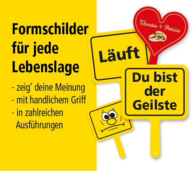Die Schilder in der Kategorie Dekoschilder - Funschilder sind in zahlreichen Größen und Ausführungen erhältlich – als Standardartikel oder in individuellen Ausführungen mit Ihrem Wunschtext, sofern dies von uns vorgesehen wurde. Textänderungen lassen sich direkt über die Artikeldetailseiten vornehmen – einfach im zuständigen Eingabefeld eingeben und bestellen. Wir schicken Ihnen dann eine Korrektur zur Ansicht, die Sie freigeben müssen. Sollten Sie Fun-Schilder in unserem Online-Shop vermissen, bitten wir um Nachricht. Wir fertigen lustige und originelle Schilder auch nach Ihren Wünschen. Gerne unterbreiten wir Ihnen unser Angebot. Anregungen zur Erweiterung unseres Schildersortiments sind uns willkommen.