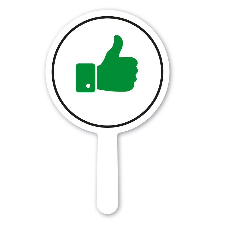 Jury-Handschilder mit Daumen hoch - Daumen neutral - Daumen runter als Set oder Einzelschilder mit einem praktischen Handgriff zum Hochhalten. Für die einfache Bewertung. Unsere formgefrästen Bewertungsschilder sind aufgrund neuem Material ausgesprochen stabil und langlebig.