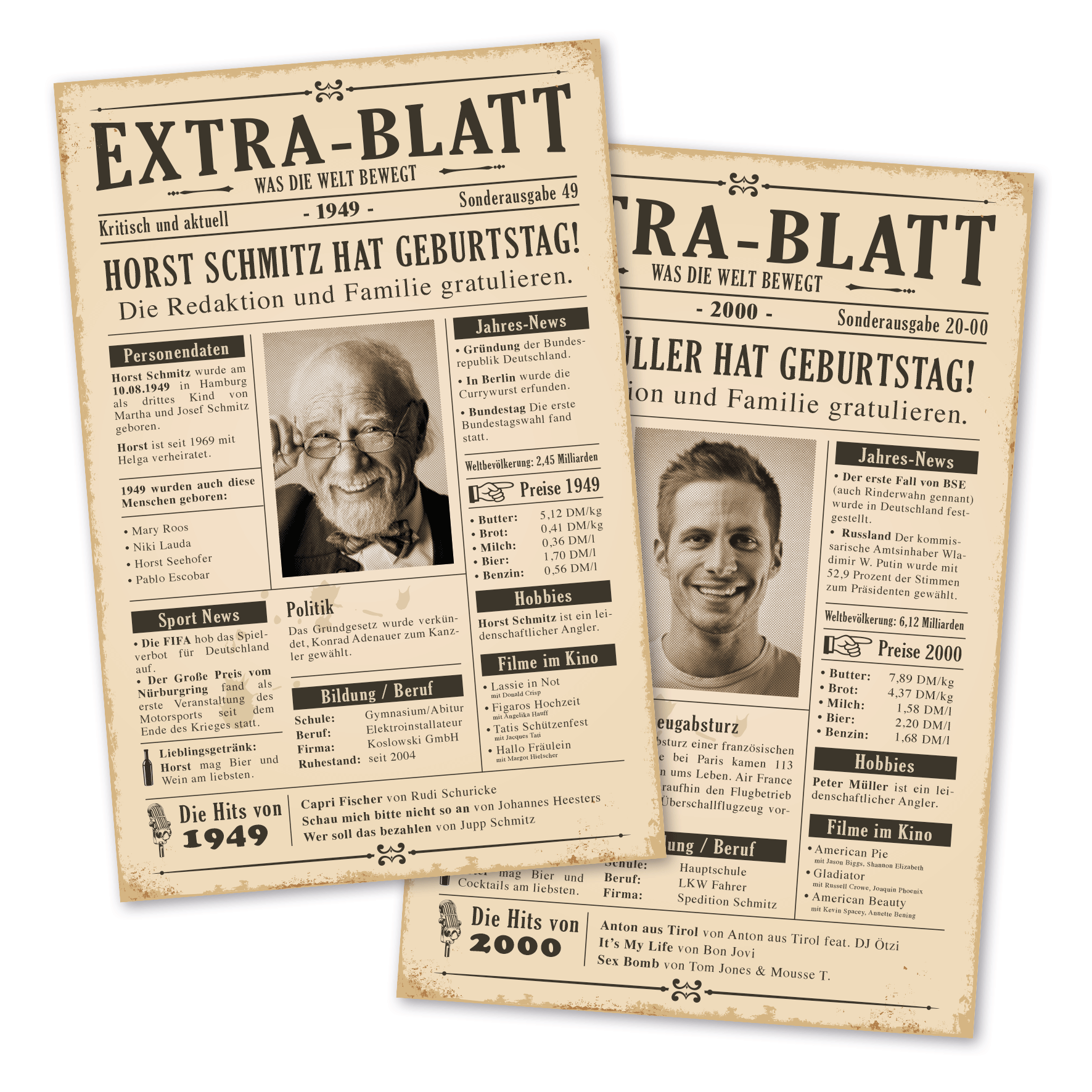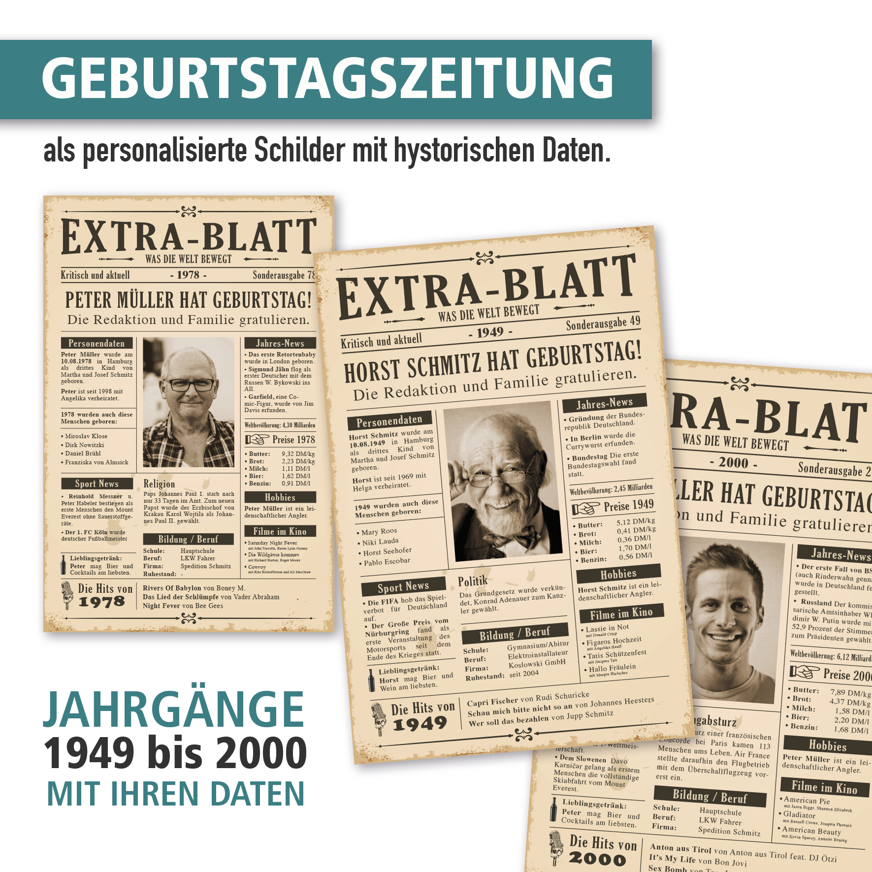 Unsere Geburtstagszeitung im Retro Look mit historischen Fakten zum jeweiligen Jahr, Ihrem Foto und persönlichen Daten ist das perfekte Geburtstagsgeschenk. Überraschen Sie das Geburtstagskind mit einem hochwertigen Schild im Stil eines Extrablatts aus vergangenen Zeiten. Unsere Geburtstagszeitung ist für die Jahre 1949 bis 2000 ausgelegt, die jeweiligen Fakten entsprechen in Kurzform den damaligen Jahresereignissen. Diese Fakten, kombiniert mit dem Foto und Personendaten des Geburtstagskindes, setzen wir zu einer informativen und bleibenden Erinnerung zusammen, die die beschenkte Person sicherlich begeistern wird. Unsere Geburtstagszeitungen als Schilder bestechen durch einen brillanten, kontrastreichen Druck und Langlebigkeit, sie sind massiv, da aus 3 mm Aluminium-Verbundmaterial, und daher ausgesprochen formstabil. Ihr Foto und Ihre Wunschdaten können Sie uns ganz bequem im Rahmen der Bestellung über die Upload-Funktion und die Texteingabefelder im Konfigurator auf dieser Seite zukommen lassen.  Bitte beachten Sie weiter unten unsere Angaben zur Personalisierung dieser Schilder.