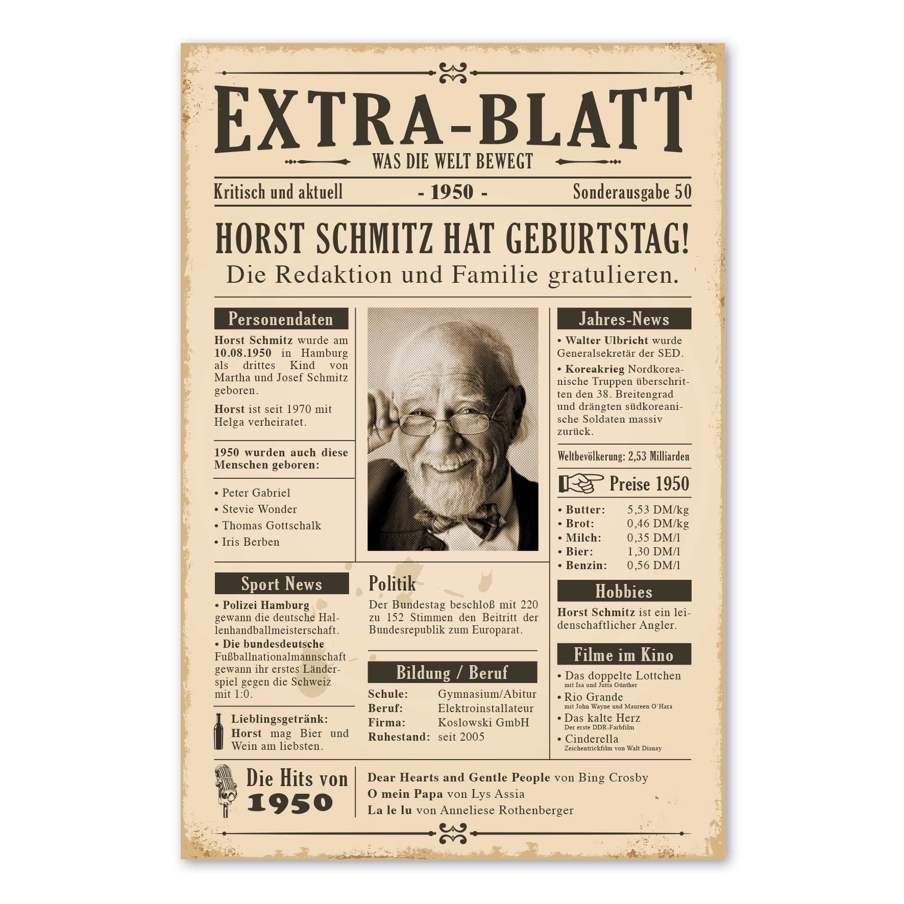 Geburtstagszeitung mit historischen Fakten, Ihrem Foto und persönlichen Daten als Schild