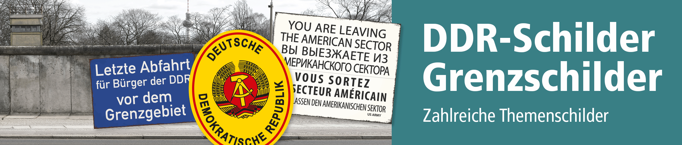 In dieser Kategorie führen wir zahlreiche Schilder zur Deutschen Demokratischen Republik - DDR - und diverse Zonenschilder. Unsere Schilder orientieren sich an alten Originalen und erinnern an Zeiten, als Deutschland noch getrennt war. Diese Kategorie beinhaltet aber auch lustige Schilder zur DDR-Geschichte sowie Grenzschilder zum Thema wie auch für andere Länder und Zeitepochen.