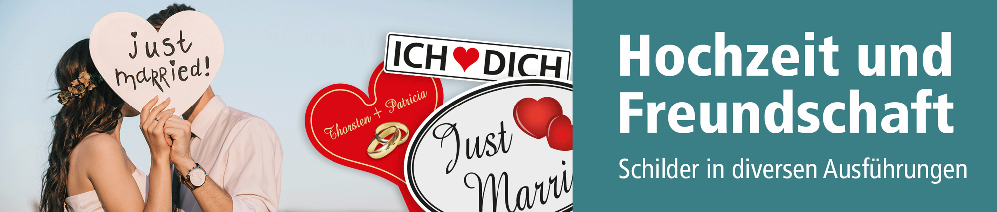 Nicht zu kurz kommt bei uns auch die Thematik Hochzeit, Liebe und Freundschaft. So führen wir diverse Schilder für den großen Tag – zur Kennzeichnung festlicher Räumlichkeiten in Form von Hinweisschildern und Tischschildern, lustigen Ortstafeln zum Verschenken, und natürlich auch Artikel für das Brautpaarfahrzeug, so z.B. magnetisch haftende Folien mit dem Hinweis "Just married" oder Schilder im schmalen Format mit dem Schriftzug "Frisch verheiratet".