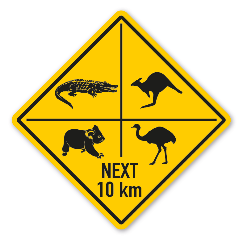 Australisches Warnschild / Verkehrsschild Achtung Crocodile - Kangaroo - Koala - Emu next 10 km. Unsere internationalen Schilder entsprechen grafisch den jeweiligen Originalen und sind in diversen Ausführungen und Größen erhältlich – auf Wunsch, auch mit Ihrem Wunschtext.