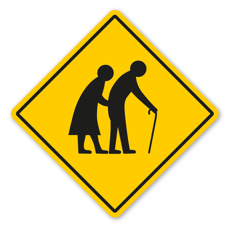 Warnschild Achtung Elderly People crossing - mit und ohne Text. Unsere internationalen Schilder sind in diversen Ausführungen und Größen erhältlich – auf Wunsch, auch mit Ihrem Wunschtext.