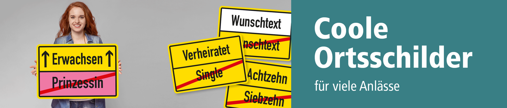 Ortsschild mit 2 Pfeilen – Prinzessin - Erwachsen. Lustige Ortsschilder bereichern jeden zu feiernden Anlass – als Hinweis an Fahrzeugen, in Räumlichkeiten oder als originelles Erinnerungsgeschenk. Unsere Ortschilder zum Verschenken sind als Standardschilder oder in einer individualisierten Ausführung erhältlich. Merkmale des Fun - Schildes Ortsschild – Prinzessin - Erwachsen – VZ-OS-14: Material: Aluminium 2 mm PVC - Hartschaum 3 mm (nur für einen mittelfristigen Einsatz) Ausführung: standard weiß / Grund gelb. Alternative Ausführungen sind möglich. Abmessungen: (nicht in allen Materialien erhältlich) 300 x 200 mm 450 x 300 mm 600 x 400 mm 750 x 500 mm 900 x 600 mm Verarbeitung: rechteckig beschnitten mit abgerundeten Ecken (nur Aluminium). Schilder aus PVC - Hartschaum werden nur mit spitzen Ecken produziert. Verpackungseinheiten: 1 Hochzeitsschild Bitte beachten Sie: Dieses Ortsschild kann mit individuellen Attributen bestellt werden. Geben Sie Ihren Wunschtext in das Eingabefeld auf dieser Seite ein. Nach Ihrer Bestellung setzen wir Ihre Wünsche um und übermittelt Ihnen eine Korrekturdatei zur Ansicht. Bitte prüfen Sie die Inhalte dieser Korrektur auf Fehler und erteilen uns, sofern alles in Ordnung ist, unbedingt die Druckfreigabe. Ihr Schild kann erst dann produziert werden, wenn uns Ihre Druckfreigabe vorliegt. Schilder mit Text- und Zeichenänderungen oder nach Ihrer Vorgabe gelocht sind individuelle Schilder und somit grundsätzlich vom Rückgaberecht ausgeschlossen. Für eine bessere Sichtbarkeit im Dunkeln wird die reflektierende Schildervariante empfohlen – angestrahlt von Autoscheinwerfern leuchtet das Schild hell in der Dunkelheit. Wünschen Sie andere Schilder – z.B. aus dem Bereich der Sicherheitskennzeichnung oder Betriebsschilder mit Symbolen? Informieren Sie sich in den jeweiligen Kategorien oder in unserem Download-Bereich.