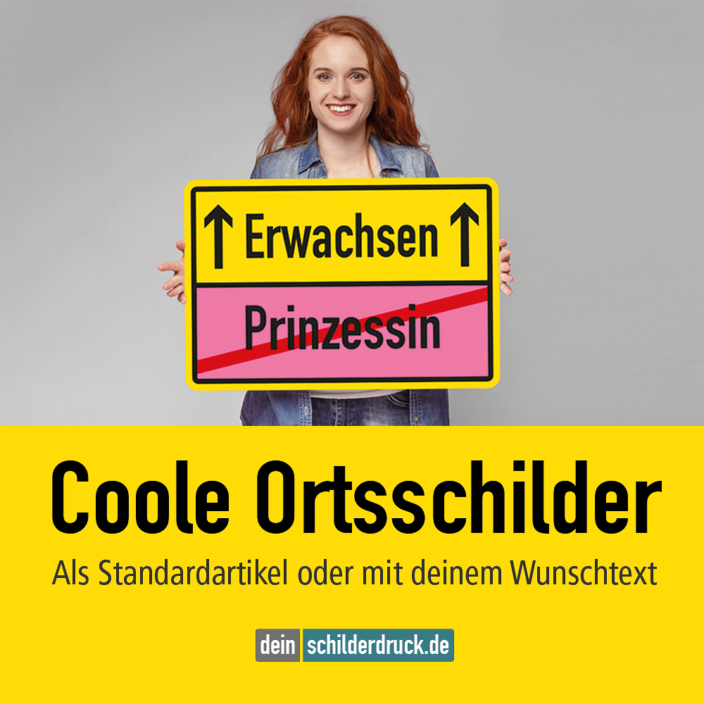 Ortsschild mit Wunschtext – weißes Feld oben. Lustige Ortsschilder bereichern jeden zu feiernden Anlass – als Hinweis an Fahrzeugen, in Räumlichkeiten oder als originelles Erinnerungsgeschenk. Unsere Ortschilder zum Verschenken sind als Standardschilder oder in einer individualisierten Ausführung erhältlich. Merkmale des Fun - Schildes Ortsschild mit Wunschtext – weißes Feld oben – VZ-OS-IND-01: Material: Aluminium 2 mm PVC - Hartschaum 3 mm (nur für einen mittelfristigen Einsatz) Ausführung: standard weiß / Grund gelb. Alternative Ausführungen sind möglich. Abmessungen: (nicht in allen Materialien erhältlich) 300 x 200 mm 450 x 300 mm 600 x 400 mm 750 x 500 mm 900 x 600 mm Verarbeitung: rechteckig beschnitten mit abgerundeten Ecken (nur Aluminium). Schilder aus PVC - Hartschaum werden nur mit spitzen Ecken produziert. Verpackungseinheiten: 1 Fun - Ortsschild Bitte beachten Sie: Dieses Ortsschild kann mit individuellen Attributen bestellt werden. Geben Sie Ihren Wunschtext in das Eingabefeld auf dieser Seite ein. Nach Ihrer Bestellung setzen wir Ihre Wünsche um und übermittelt Ihnen eine Korrekturdatei zur Ansicht. Bitte prüfen Sie die Inhalte dieser Korrektur auf Fehler und erteilen uns, sofern alles in Ordnung ist, unbedingt die Druckfreigabe. Ihr Schild kann erst dann produziert werden, wenn uns Ihre Druckfreigabe vorliegt. Schilder mit Text- und Zeichenänderungen oder nach Ihrer Vorgabe gelocht sind individuelle Schilder und somit grundsätzlich vom Rückgaberecht ausgeschlossen. Für eine bessere Sichtbarkeit im Dunkeln wird die reflektierende Schildervariante empfohlen – angestrahlt von Autoscheinwerfern leuchtet das Schild hell in der Dunkelheit. Wünschen Sie andere Schilder – z.B. aus dem Bereich der Sicherheitskennzeichnung oder Betriebsschilder mit Symbolen? Informieren Sie sich in den jeweiligen Kategorien oder in unserem Download-Bereich.
