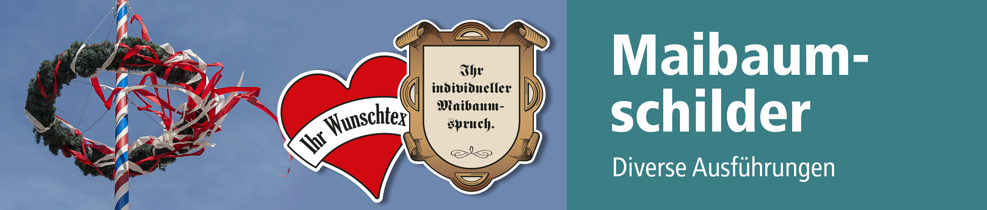 In dieser Rubrik führen wir eine Reihe Schilder rund um den 1. Mai, darunter Maibaumschilder mit Sprüchen oder einem Motto nach Ihren Vorgaben sowie herzförmige Maibaumschilder mit Banderole für den kleinen Maibaum. Diesese Herzschilder sind auch zum Selbstbeschriften in mehreren Farbausführungen erhältlich.