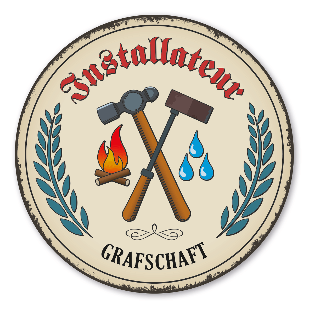 Merkmale des Maibaumschildes / Zunftwappens / Festschildes mit Zunftwappen Installateur - Heizungsbau - Sanitär - mit Zunftnamen und Ihrem Ortsnamen oder Wunschtext - Rundes Wappen - Retro - MAI-VIN-17: