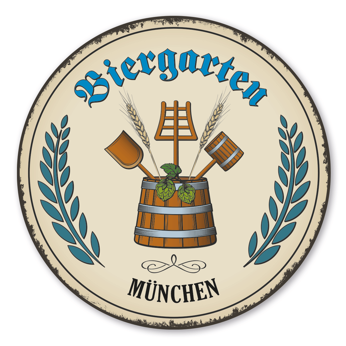 Maibaumschild / Festschild Biergarten mit Zunftwappen Bierbrauer und Ihrem Ortsnamen oder Wunschtext - Rundes Wappen - Retro