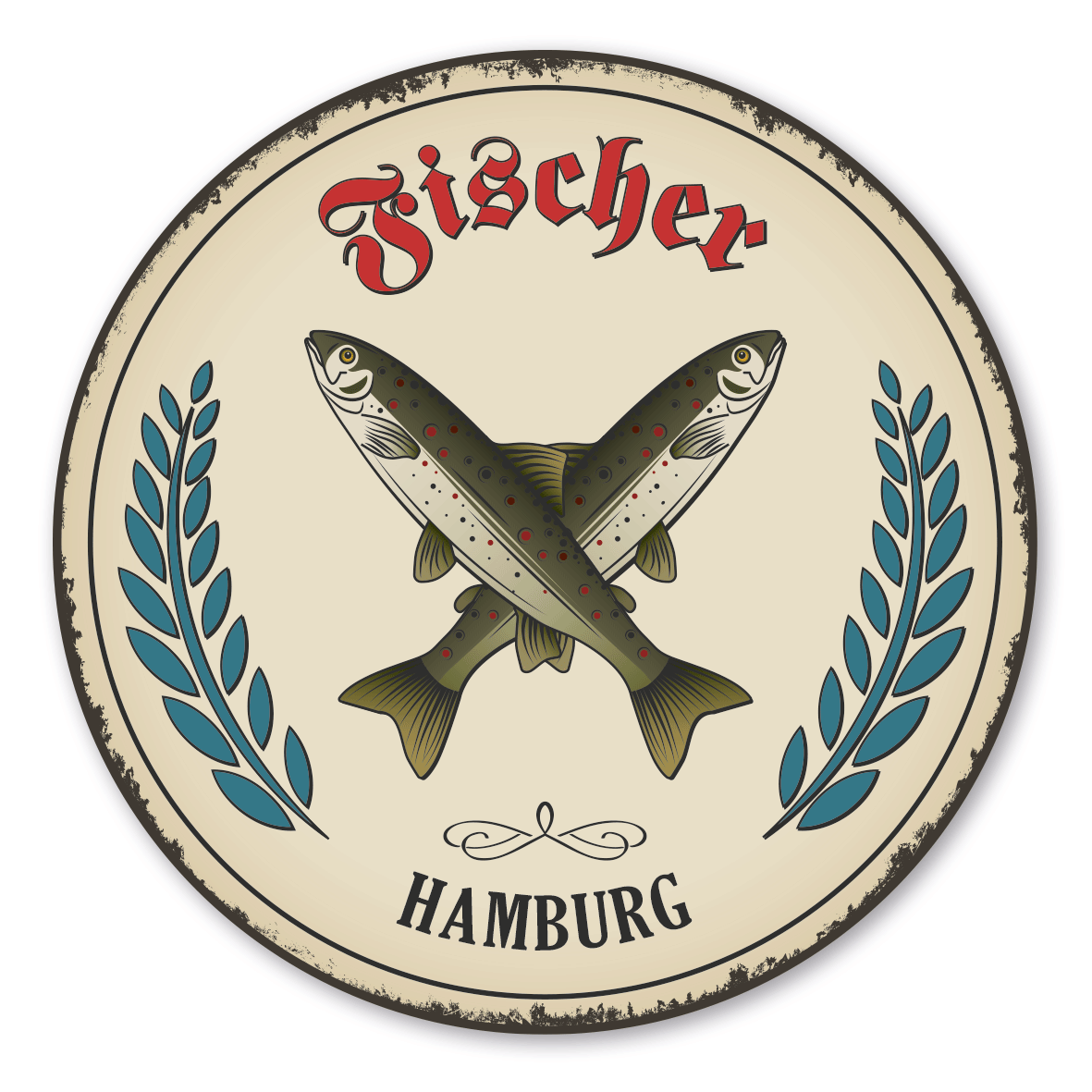 Maibaumschild / Festschild mit Zunftwappen Fischer - mit Zunftnamen und Ihrem Ortsnamen oder Wunschtext - Rundes Wappen - Retro