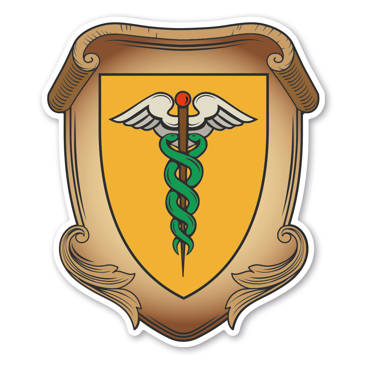 Maibaumschild / Zunftschild Medicus - Arzt. Unsere Maibaumschilder und Zunftwappen sind in Ihrer Symbolik mittelalterlichen oder neueren Ausführungen der Zunftzeichen einzelner Handwerksgilden nachempfunden. Da die Handwerkswappen der einzelnen Berufsstände je nach Stadt, Land oder Zeitepoche stark variieren können, haben wir uns bei der grafischen Umsetzung auf allgemein gebräuchliche Abbildungen der Werkzeuge und Werkzeugzusammenstellungen konzentriert. Weiterhin wurden einzelne Zunftzeichen um neuere Symbole oder Werkzeuge ergänzt, um auch neuzeitlichen Berufen gerecht zu werden. Unsere Maibaumschilder zur Brauchtumspflege aus deutscher Fertigung sind langlebig, außerordentlich stabil und somit wahre Schmückstücke für jeden Maibaum.