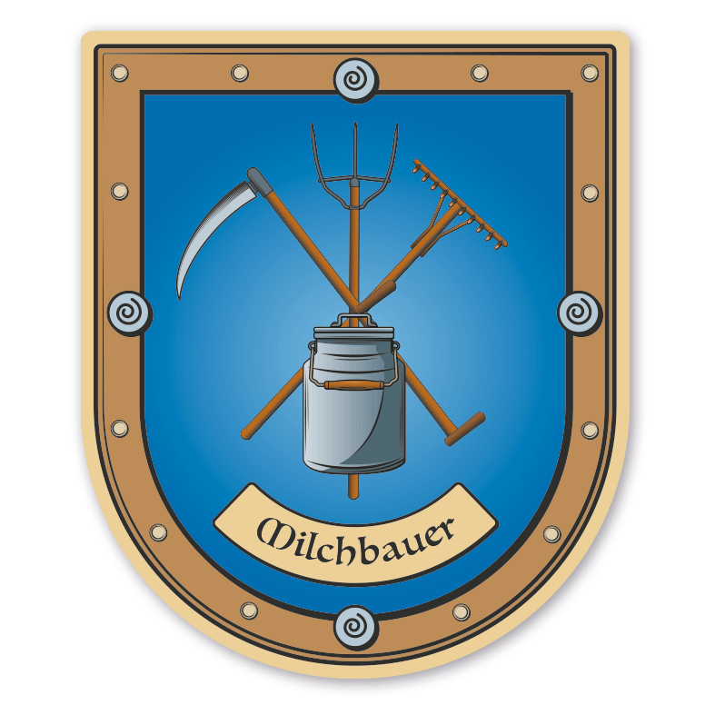 Maibaumschild / Zunftschild Milchbauer - Landwirt - mit Zunftnamen oder Ihrem Wunschtext. Unsere Maibaumschilder und Zunftwappen sind in Ihrer Symbolik mittelalterlichen oder neueren Ausführungen der Zunftzeichen einzelner Handwerksgilden nachempfunden. Da die Handwerkswappen der einzelnen Berufsstände je nach Stadt, Land oder Zeitepoche stark variieren können, haben wir uns bei der grafischen Umsetzung auf allgemein gebräuchliche Abbildungen der Werkzeuge und Werkzeugzusammenstellungen konzentriert. Weiterhin wurden einzelne Zunftzeichen um neuere Symbole oder Werkzeuge ergänzt, um auch neuzeitlichen Berufen gerecht zu werden.  Unsere Maibaumschilder zur Brauchtumspflege aus deutscher Fertigung sind langlebig, außerordentlich stabil und somit wahre Schmückstücke für jeden Maibaum.