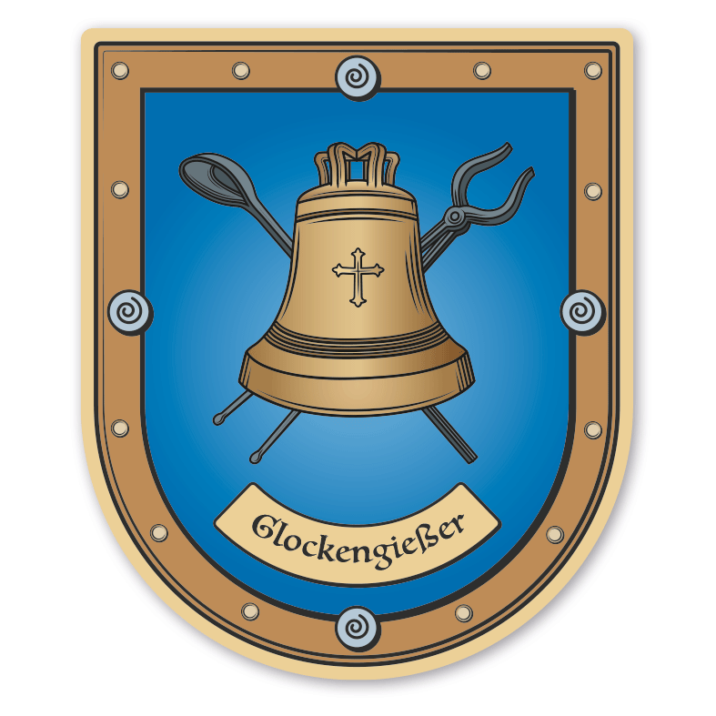 Maibaumschild / Zunftschild Glockengießer - mit Zunftnamen oder Ihrem Wunschtext. Unsere Maibaumschilder und Zunftwappen sind in Ihrer Symbolik mittelalterlichen oder neueren Ausführungen der Zunftzeichen einzelner Handwerksgilden nachempfunden. Da die Handwerkswappen der einzelnen Berufsstände je nach Stadt, Land oder Zeitepoche stark variieren können, haben wir uns bei der grafischen Umsetzung auf allgemein gebräuchliche Abbildungen der Werkzeuge und Werkzeugzusammenstellungen konzentriert. Weiterhin wurden einzelne Zunftzeichen um neuere Symbole oder Werkzeuge ergänzt, um auch neuzeitlichen Berufen gerecht zu werden.  Unsere Maibaumschilder zur Brauchtumspflege aus deutscher Fertigung sind langlebig, außerordentlich stabil und somit wahre Schmückstücke für jeden Maibaum.