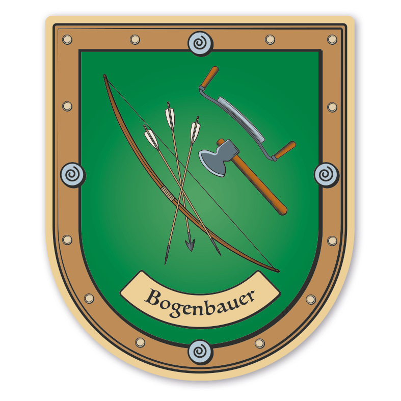 Maibaumschild / Zunftschild Bogenbauer - Bogner - mit Zunftnamen oder Ihrem Wunschtext. Unsere Maibaumschilder und Zunftwappen sind in Ihrer Symbolik mittelalterlichen oder neueren Ausführungen der Zunftzeichen einzelner Handwerksgilden nachempfunden. Da die Handwerkswappen der einzelnen Berufsstände je nach Stadt, Land oder Zeitepoche stark variieren können, haben wir uns bei der grafischen Umsetzung auf allgemein gebräuchliche Abbildungen der Werkzeuge und Werkzeugzusammenstellungen konzentriert. Weiterhin wurden einzelne Zunftzeichen um neuere Symbole oder Werkzeuge ergänzt, um auch neuzeitlichen Berufen gerecht zu werden.  Unsere Maibaumschilder zur Brauchtumspflege aus deutscher Fertigung sind langlebig, außerordentlich stabil und somit wahre Schmückstücke für jeden Maibaum.