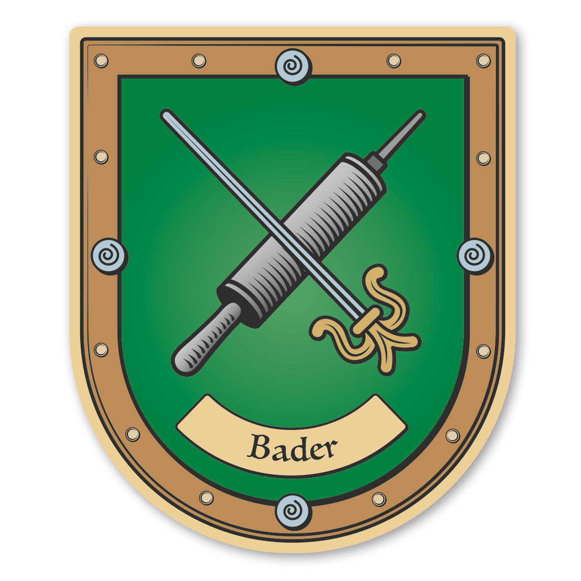 Maibaumschild / Zunftschild Bader und Wundärzte mit Zunftnamen oder Ihrem Wunschtext. Unsere Maibaumschilder und Zunftwappen sind in Ihrer Symbolik mittelalterlichen oder neueren Ausführungen der Zunftzeichen einzelner Handwerksgilden nachempfunden. Da die Handwerkswappen der einzelnen Berufsstände je nach Stadt, Land oder Zeitepoche stark variieren können, haben wir uns bei der grafischen Umsetzung auf allgemein gebräuchliche Abbildungen der Werkzeuge und Werkzeugzusammenstellungen konzentriert. Weiterhin wurden einzelne Zunftzeichen um neuere Symbole oder Werkzeuge ergänzt, um auch neuzeitlichen Berufen gerecht zu werden.  Unsere Maibaumschilder zur Brauchtumspflege aus deutscher Fertigung sind langlebig, außerordentlich stabil und somit wahre Schmückstücke für jeden Maibaum.