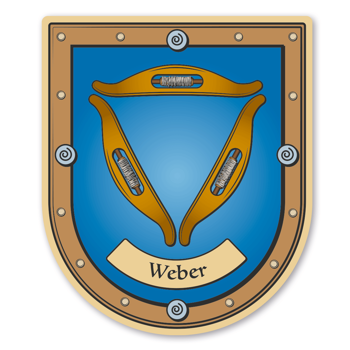 Maibaumschild / Zunftschild Weber mit Zunftnamen oder Ihrem Wunschtext. Unsere Maibaumschilder und Zunftwappen sind in Ihrer Symbolik mittelalterlichen oder neueren Ausführungen der Zunftzeichen einzelner Handwerksgilden nachempfunden. Da die Handwerkswappen der einzelnen Berufsstände je nach Stadt, Land oder Zeitepoche stark variieren können, haben wir uns bei der grafischen Umsetzung auf allgemein gebräuchliche Abbildungen der Werkzeuge und Werkzeugzusammenstellungen konzentriert. Weiterhin wurden einzelne Zunftzeichen um neuere Symbole oder Werkzeuge ergänzt, um auch neuzeitlichen Berufen gerecht zu werden. Unsere Maibaumschilder zur Brauchtumspflege aus deutscher Fertigung sind langlebig, außerordentlich stabil und somit wahre Schmückstücke für jeden Maibaum.