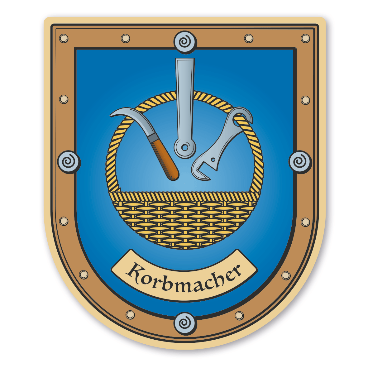 Maibaumschild / Zunftschild Korbmacher - Korbflechter - mit Zunftnamen oder Ihrem Wunschtext. Unsere Maibaumschilder und Zunftwappen sind in Ihrer Symbolik mittelalterlichen oder neueren Ausführungen der Zunftzeichen einzelner Handwerksgilden nachempfunden. Da die Handwerkswappen der einzelnen Berufsstände je nach Stadt, Land oder Zeitepoche stark variieren können, haben wir uns bei der grafischen Umsetzung auf allgemein gebräuchliche Abbildungen der Werkzeuge und Werkzeugzusammenstellungen konzentriert. Weiterhin wurden einzelne Zunftzeichen um neuere Symbole oder Werkzeuge ergänzt, um auch neuzeitlichen Berufen gerecht zu werden. Unsere Maibaumschilder zur Brauchtumspflege aus deutscher Fertigung sind langlebig, außerordentlich stabil und somit wahre Schmückstücke für jeden Maibaum.