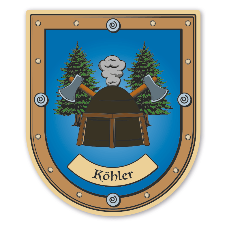 Maibaumschild / Zunftschild Köhler - mit Zunftnamen oder Ihrem Wunschtext. Unsere Maibaumschilder und Zunftwappen sind in Ihrer Symbolik mittelalterlichen oder neueren Ausführungen der Zunftzeichen einzelner Handwerksgilden nachempfunden. Da die Handwerkswappen der einzelnen Berufsstände je nach Stadt, Land oder Zeitepoche stark variieren können, haben wir uns bei der grafischen Umsetzung auf allgemein gebräuchliche Abbildungen der Werkzeuge und Werkzeugzusammenstellungen konzentriert. Weiterhin wurden einzelne Zunftzeichen um neuere Symbole oder Werkzeuge ergänzt, um auch neuzeitlichen Berufen gerecht zu werden. Unsere Maibaumschilder zur Brauchtumspflege aus deutscher Fertigung sind langlebig, außerordentlich stabil und somit wahre Schmückstücke für jeden Maibaum.