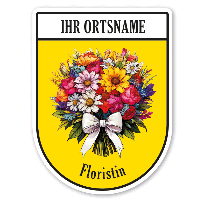 Maibaumschild Floristin - Florist - Floristik mit Zunftnamen, Ortsnamen oder Ihrem Wunschtext. Unsere Maibaumschilder und Zunftwappen sind in Ihrer Symbolik mittelalterlichen oder neueren Ausführungen der Zunftzeichen einzelner Handwerksgilden nachempfunden. Da die Handwerkswappen der einzelnen Berufsstände je nach Stadt, Land oder Zeitepoche stark variieren können, haben wir uns bei der grafischen Umsetzung auf allgemein gebräuchliche Abbildungen der Werkzeuge und Werkzeugzusammenstellungen konzentriert. Weiterhin wurden einzelne Zunftzeichen um neuere Symbole oder Werkzeuge ergänzt, um auch neuzeitlichen Berufen gerecht zu werden. Unsere Maibaumschilder zur Brauchtumspflege aus deutscher Fertigung sind langlebig, außerordentlich stabil und somit wahre Schmückstücke für jeden Maibaum.