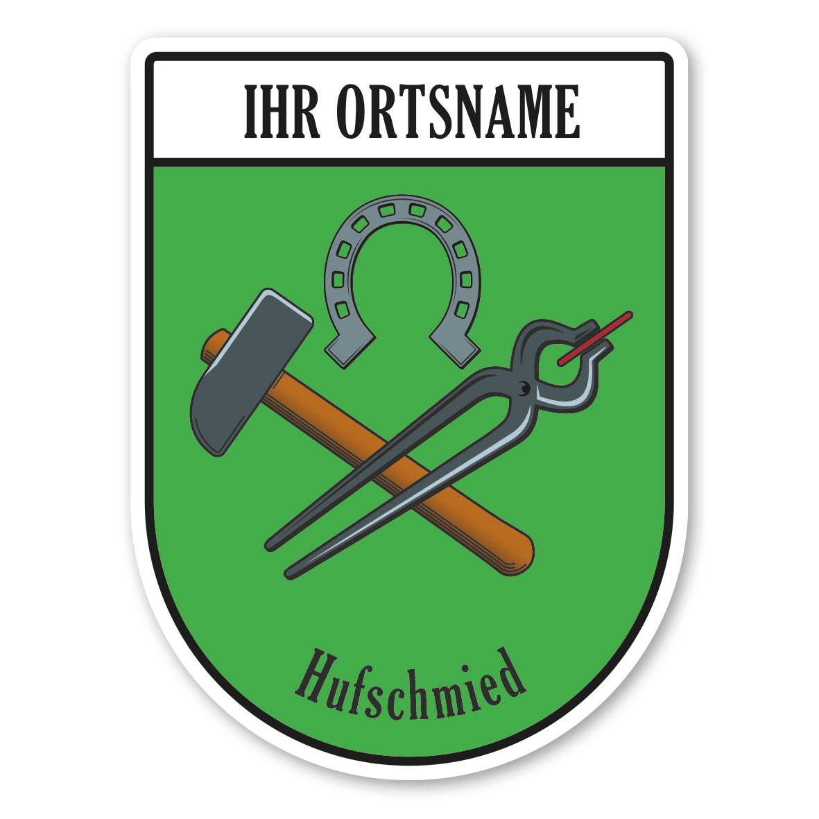 Maibaumschild / Zunftschild Hufschmied mit Zunftnamen, Ortsnamen oder Ihrem Wunschtext. Unsere Maibaumschilder und Zunftwappen sind in Ihrer Symbolik mittelalterlichen oder neueren Ausführungen der Zunftzeichen einzelner Handwerksgilden nachempfunden. Da die Handwerkswappen der einzelnen Berufsstände je nach Stadt, Land oder Zeitepoche stark variieren können, haben wir uns bei der grafischen Umsetzung auf allgemein gebräuchliche Abbildungen der Werkzeuge und Werkzeugzusammenstellungen konzentriert. Weiterhin wurden einzelne Zunftzeichen um neuere Symbole oder Werkzeuge ergänzt, um auch neuzeitlichen Berufen gerecht zu werden. Unsere Maibaumschilder zur Brauchtumspflege aus deutscher Fertigung sind langlebig, außerordentlich stabil und somit wahre Schmückstücke für jeden Maibaum.