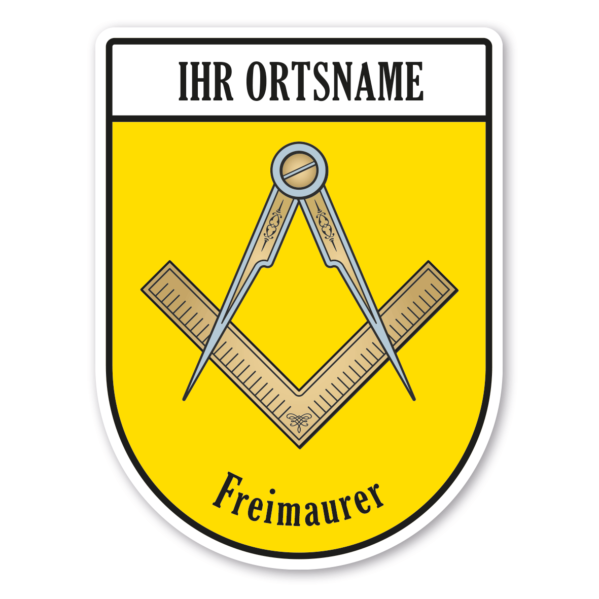 Maibaumschild / Zunftschild Freimaurer mit Zunftnamen, Ortsnamen oder Ihrem Wunschtext. Unsere Maibaumschilder und Zunftwappen sind in Ihrer Symbolik mittelalterlichen oder neueren Ausführungen der Zunftzeichen einzelner Handwerksgilden nachempfunden. Da die Handwerkswappen der einzelnen Berufsstände je nach Stadt, Land oder Zeitepoche stark variieren können, haben wir uns bei der grafischen Umsetzung auf allgemein gebräuchliche Abbildungen der Werkzeuge und Werkzeugzusammenstellungen konzentriert. Weiterhin wurden einzelne Zunftzeichen um neuere Symbole oder Werkzeuge ergänzt, um auch neuzeitlichen Berufen gerecht zu werden. Unsere Maibaumschilder zur Brauchtumspflege aus deutscher Fertigung sind langlebig, außerordentlich stabil und somit wahre Schmückstücke für jeden Maibaum.