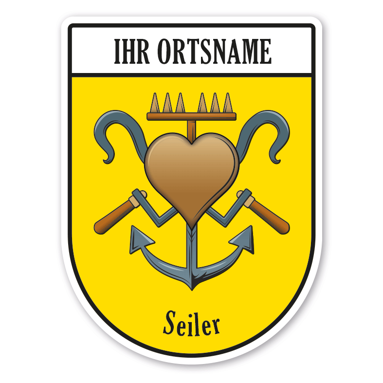 Maibaumschild Seiler - Reepschläger mit Zunftnamen, Ortsnamen oder Ihrem Wunschtext. Unsere Maibaumschilder und Zunftwappen sind in Ihrer Symbolik mittelalterlichen oder neueren Ausführungen der Zunftzeichen einzelner Handwerksgilden nachempfunden. Da die Handwerkswappen der einzelnen Berufsstände je nach Stadt, Land oder Zeitepoche stark variieren können, haben wir uns bei der grafischen Umsetzung auf allgemein gebräuchliche Abbildungen der Werkzeuge und Werkzeugzusammenstellungen konzentriert. Weiterhin wurden einzelne Zunftzeichen um neuere Symbole oder Werkzeuge ergänzt, um auch neuzeitlichen Berufen gerecht zu werden. Unsere Maibaumschilder zur Brauchtumspflege aus deutscher Fertigung sind langlebig, außerordentlich stabil und somit wahre Schmückstücke für jeden Maibaum.