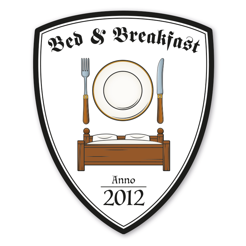 Maibaumschild / Zunftschild Bed & Breakfast mit Zunftnamen, Gründungsjahr oder Ihrem Wunschtext. Unsere Maibaumschilder und Zunftwappen sind in Ihrer Symbolik mittelalterlichen oder neueren Ausführungen der Zunftzeichen einzelner Handwerksgilden nachempfunden. Da die Handwerkswappen der einzelnen Berufsstände je nach Stadt, Land oder Zeitepoche stark variieren können, haben wir uns bei der grafischen Umsetzung auf allgemein gebräuchliche Abbildungen der Werkzeuge und Werkzeugzusammenstellungen konzentriert. Weiterhin wurden einzelne Zunftzeichen um neuere Symbole oder Werkzeuge ergänzt, um auch neuzeitlichen Berufen gerecht zu werden. Unsere Maibaumschilder zur Brauchtumspflege aus deutscher Fertigung sind langlebig, außerordentlich stabil und somit wahre Schmückstücke für jeden Maibaum.
