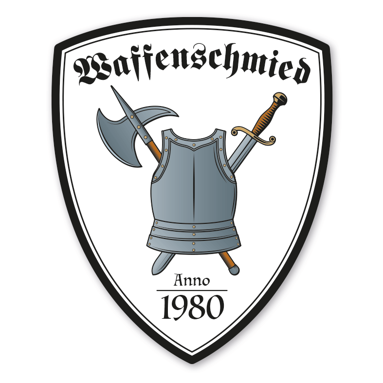 Maibaumschild / Zunftschild Waffenschmied - Schmied mit Zunftnamen, Gründungsjahr oder Ihrem Wunschtext. Unsere Maibaumschilder und Zunftwappen sind in Ihrer Symbolik mittelalterlichen oder neueren Ausführungen der Zunftzeichen einzelner Handwerksgilden nachempfunden. Da die Handwerkswappen der einzelnen Berufsstände je nach Stadt, Land oder Zeitepoche stark variieren können, haben wir uns bei der grafischen Umsetzung auf allgemein gebräuchliche Abbildungen der Werkzeuge und Werkzeugzusammenstellungen konzentriert. Weiterhin wurden einzelne Zunftzeichen um neuere Symbole oder Werkzeuge ergänzt, um auch neuzeitlichen Berufen gerecht zu werden.  Unsere Maibaumschilder zur Brauchtumspflege aus deutscher Fertigung sind langlebig, außerordentlich stabil und somit wahre Schmückstücke für jeden Maibaum.