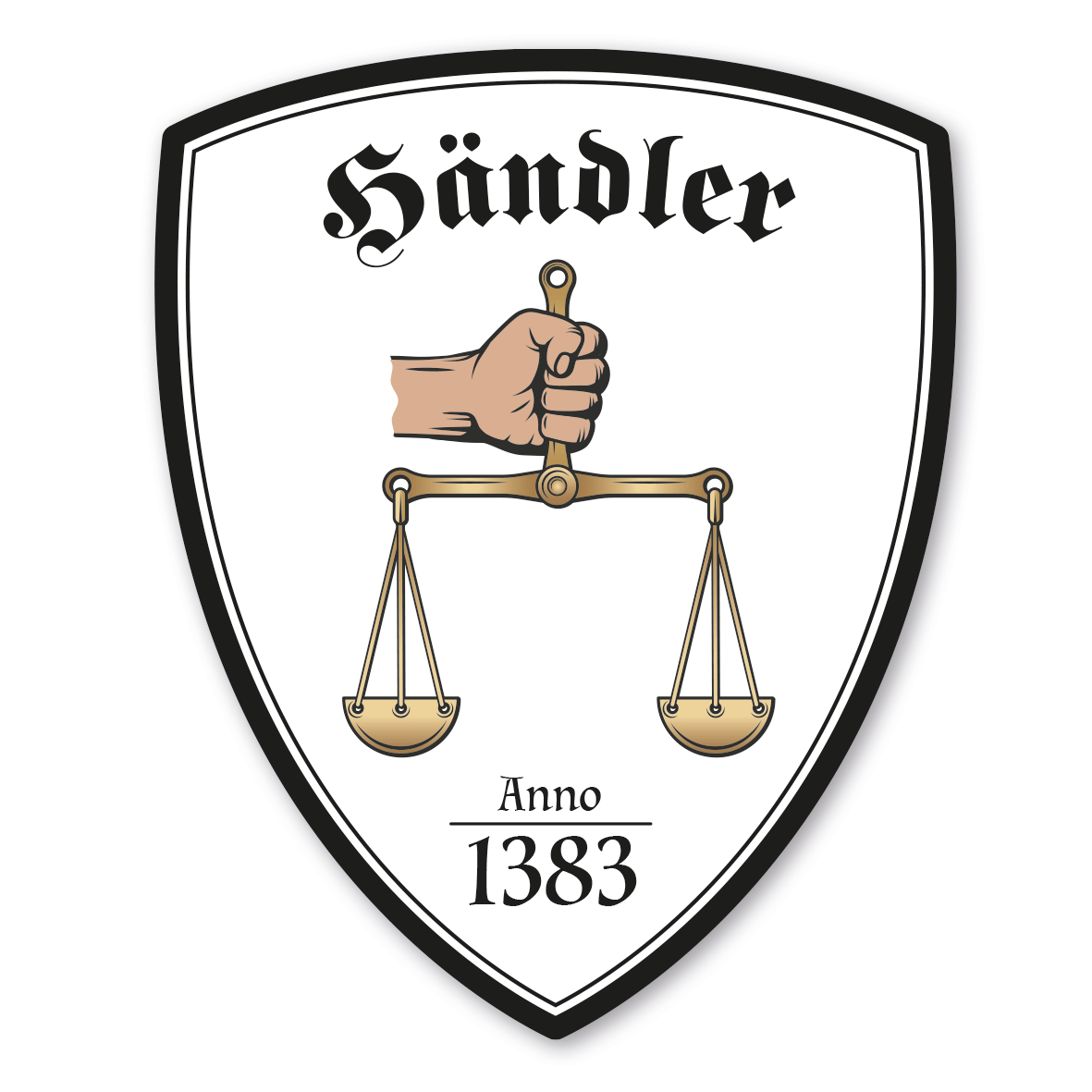 Maibaumschild / Zunftschild Krämer - Händler - Kaufleute mit Zunftnamen, Gründungsjahr oder Ihrem Wunschtext. Unsere Maibaumschilder und Zunftwappen sind in Ihrer Symbolik mittelalterlichen oder neueren Ausführungen der Zunftzeichen einzelner Handwerksgilden nachempfunden. Da die Handwerkswappen der einzelnen Berufsstände je nach Stadt, Land oder Zeitepoche stark variieren können, haben wir uns bei der grafischen Umsetzung auf allgemein gebräuchliche Abbildungen der Werkzeuge und Werkzeugzusammenstellungen konzentriert. Weiterhin wurden einzelne Zunftzeichen um neuere Symbole oder Werkzeuge ergänzt, um auch neuzeitlichen Berufen gerecht zu werden. Unsere Maibaumschilder zur Brauchtumspflege aus deutscher Fertigung sind langlebig, außerordentlich stabil und somit wahre Schmückstücke für jeden Maibaum.