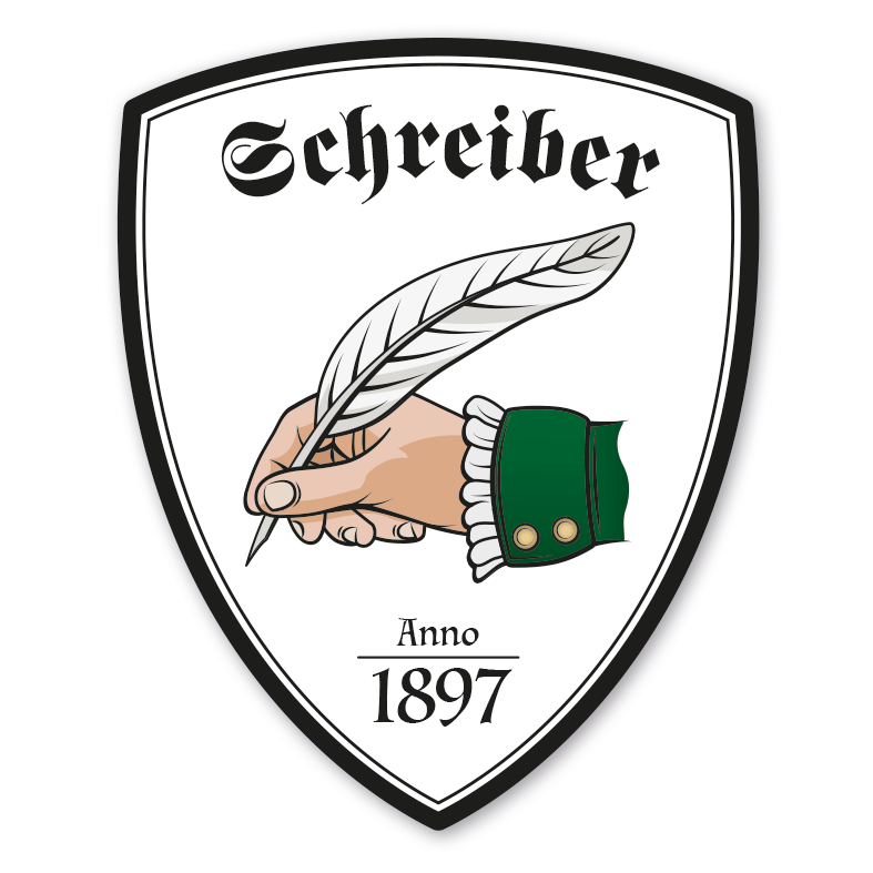 Maibaumschild / Zunftschild Schreiber mit Zunftnamen, Gründungsjahr oder Ihrem Wunschtext. Unsere Maibaumschilder und Zunftwappen sind in Ihrer Symbolik mittelalterlichen oder neueren Ausführungen der Zunftzeichen einzelner Handwerksgilden nachempfunden. Da die Handwerkswappen der einzelnen Berufsstände je nach Stadt, Land oder Zeitepoche stark variieren können, haben wir uns bei der grafischen Umsetzung auf allgemein gebräuchliche Abbildungen der Werkzeuge und Werkzeugzusammenstellungen konzentriert. Weiterhin wurden einzelne Zunftzeichen um neuere Symbole oder Werkzeuge ergänzt, um auch neuzeitlichen Berufen gerecht zu werden. Unsere Maibaumschilder zur Brauchtumspflege aus deutscher Fertigung sind langlebig, außerordentlich stabil und somit wahre Schmückstücke für jeden Maibaum.