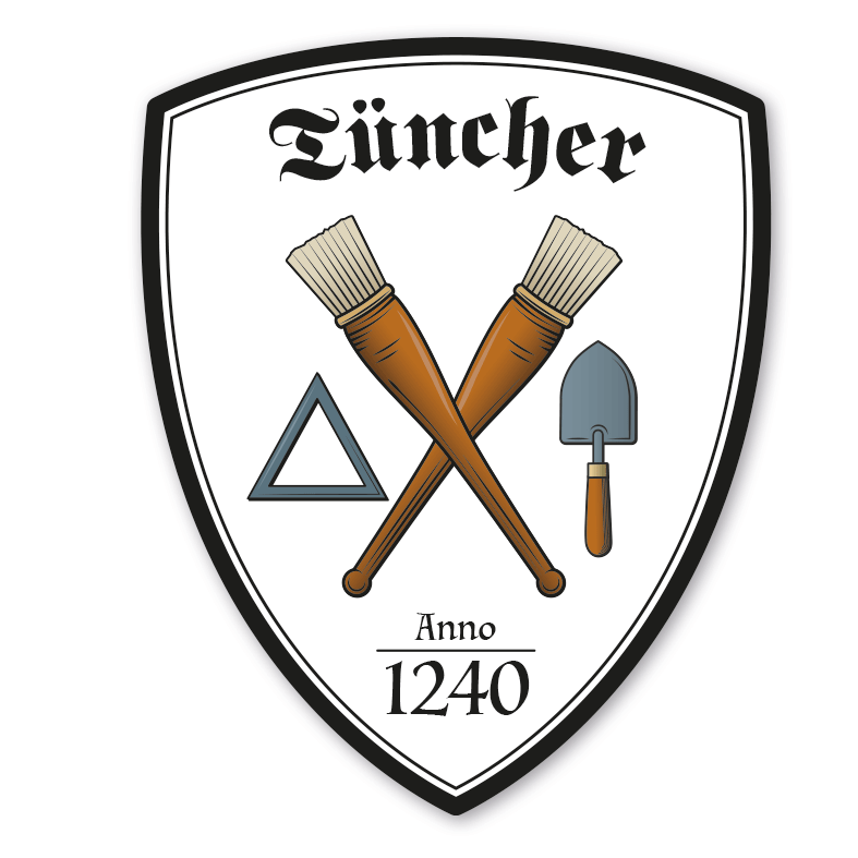 Maibaumschild / Zunftschild Tüncher mit Zunftnamen, Gründungsjahr oder Ihrem Wunschtext. Unsere Maibaumschilder und Zunftwappen sind in Ihrer Symbolik mittelalterlichen oder neueren Ausführungen der Zunftzeichen einzelner Handwerksgilden nachempfunden. Da die Handwerkswappen der einzelnen Berufsstände je nach Stadt, Land oder Zeitepoche stark variieren können, haben wir uns bei der grafischen Umsetzung auf allgemein gebräuchliche Abbildungen der Werkzeuge und Werkzeugzusammenstellungen konzentriert. Weiterhin wurden einzelne Zunftzeichen um neuere Symbole oder Werkzeuge ergänzt, um auch neuzeitlichen Berufen gerecht zu werden. Unsere Maibaumschilder zur Brauchtumspflege aus deutscher Fertigung sind langlebig, außerordentlich stabil und somit wahre Schmückstücke für jeden Maibaum.