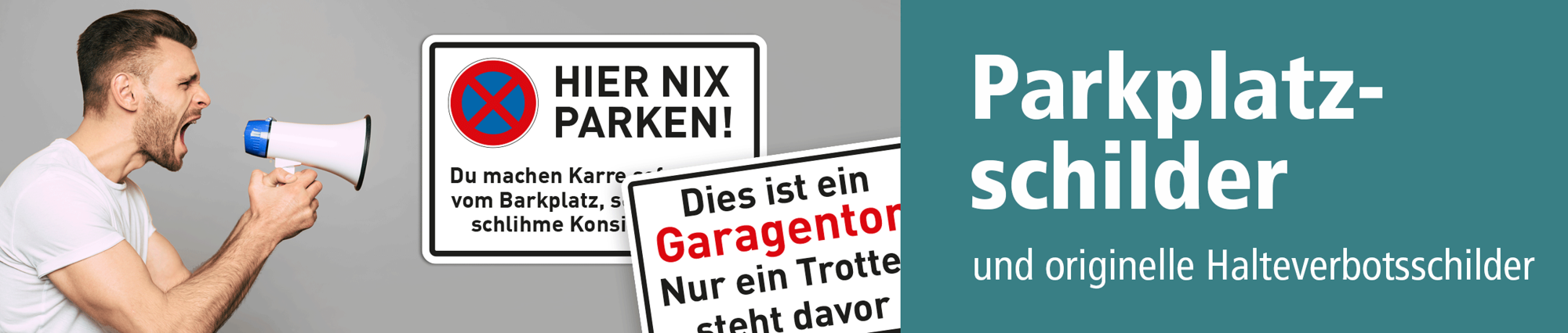 Sie ärgern sich darüber, dass irgendwelche Heinis immer wieder ihre Garagenzufahrt zuparken, und das trotz bestehender Beschilderung mit unübersehbaren Halteverbotszeichen nach StVO, einem Abschleppdienst-Symbol sowie eindeutigen Text, der das Parken vor Ihrer Zufahrt ausdrücklich verbietet? Der einfache Grund hierfür könnte sein, dass Ihr Schild ein handelsübliches Standardschild ist, das nur von verantwortungsvollen Fahrzeugeignern wahrgenommen wird, jedoch nicht von ignoranten Autofahrern. Versuchen Sie es doch mit anderen Schildern, mit im aktuellen Jargon verfassten Inhalten, die auch Vollpfosten wahrnehmen und vielleicht verstehen. Wir führen diverse Parkplatz- und Halteverbotsschilder mit "voll krassen" Inhalten, auch in größeren Formaten und sogar in reflektierenden Ausführungen für Fahrzeughalter, die an temporärem Analphabetismus leiden.