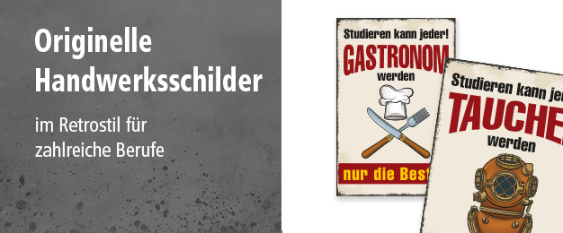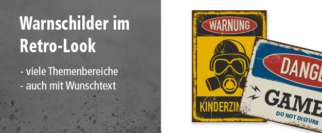 Lassen Sie sich von unseren Retroschildern und Schildern im Vintage-Look begeistern, die zahlreich und für viele Themenbereiche verfügbar sind – als Dekorationsschild für einen Hauch Nostalgie zu Hause oder als lustiges Zitat- oder Spruchschild zum verschenken, um anderen eine Freude zu bereiten. Vielleicht sagen Ihnen aber auch unsere Retro-Handwerksschilder oder Unternehmensschilder zu, die für viele Berufe erhältlich sind. Für Liebhaber von Warnschildern im alten Look halten wir ebenfalls zahlreiche Themenschilder bereit, die textlich angepasst werden können. Sie wünschen Retroschilder mit Ihrem Photo? Auch hier halten wir für Sie zahlreiche Schilder parat – schwarzweiß, farbig oder als Postkarte.