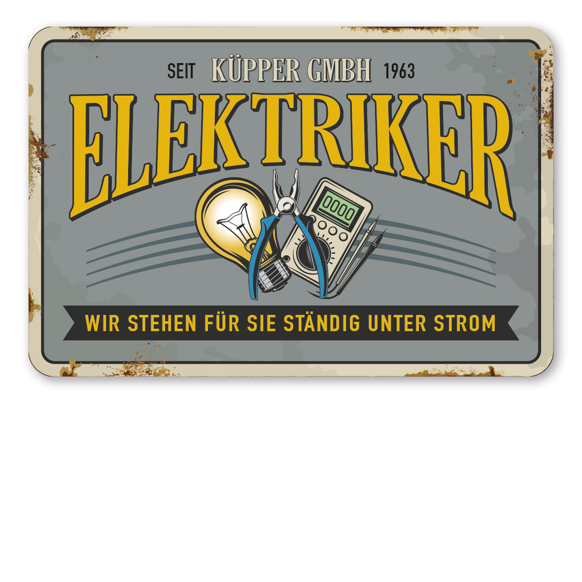 Merkmale des Retro-Schildes / Vintage-Schildes Elektriker (mit Ihrem Namenseindruck und Jahresangabe) Wir stehen für Sie ständig unter Strom - Werkstattschild - VIN-471: