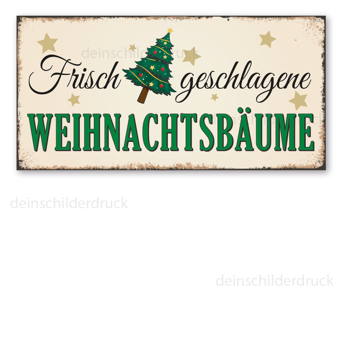 Verkaufsschild für Weihnachtsbäume im alten Look für Ihre Verkaufsstelle. Diese Schilder im Retro- oder Vintage-Look sind in zahlreichen Ausführungen erhältlich, mit Motiven oder nur Textinhalten, die je nach Artikel individuallisiert werden können. Die Patina (Kratzer und Beschädigungen) ist nicht echt, sondern nur aufgedruckt, dennoch wirken diese Schilder alt, so als wären sie vor Jahrzehnten produziert worden. Unsere hochwertigen Retro- und Vintage-Schilder werden aus 2 mm Hartaluminium gefertigt, sie sind wetterfest und in vielen Größen erhältlich. Verschenken Sie diese dekorativen Schilder als Standardartikel oder mit angepaßten Textinhalten zum Geburtstag, zur Hochzeit, oder beschenken Sie sich selbst. Den Möglichkeiten sind kaum Grenzen gesetzt.
